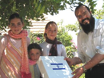 3. Rabbi Lupin presents hand made woven scarves that the women of his community made for the children of Itamar. width=