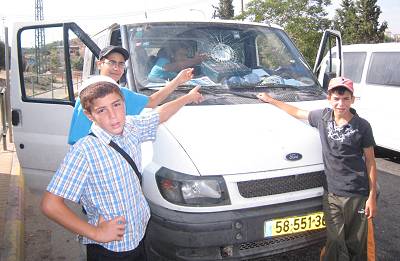2. This week the Itamar campers were returning from their welding course on the Gilad road and were attacked by a mob of Arabs that were rioting. The Itamar youth director who was driving his van and had his windows smashed. Thank G-d he managed to back up and get the teenagers out of danger. One camper was hit with a boulder in his arm. Thank G-d he is only bruised. The army was there and was hesitant about responding. Unfortunately, they did not stop the Jewish cars from getting attacked. Many other cars were hit as well, in one instance the Arab mob tried to pull the driver out of his car. Finally, one brave man shot in the air with his pistol and was later arrested by the Israeli police. Is this not absurdity? Enclosed is a picture of the car. width= width=